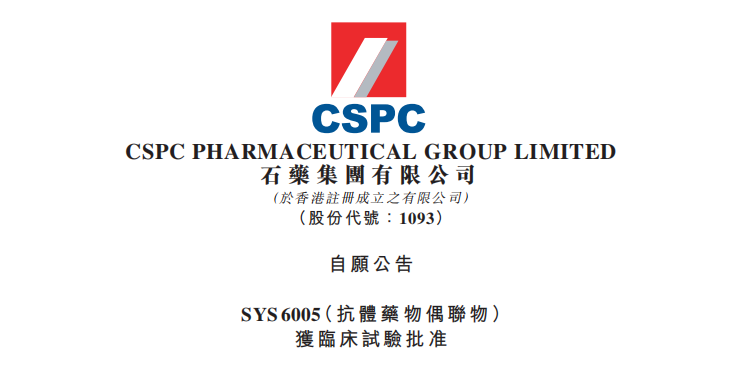 石藥集團有限公司(「本公司」,連同附屬公司欣然宣佈,本集團開發的SYS6005(抗體藥物偶聯物)(Antibody-Drug Conjugate) )已獲得中華人民共和國國家藥品監督管理局批準,可以在中國開展臨床試驗。