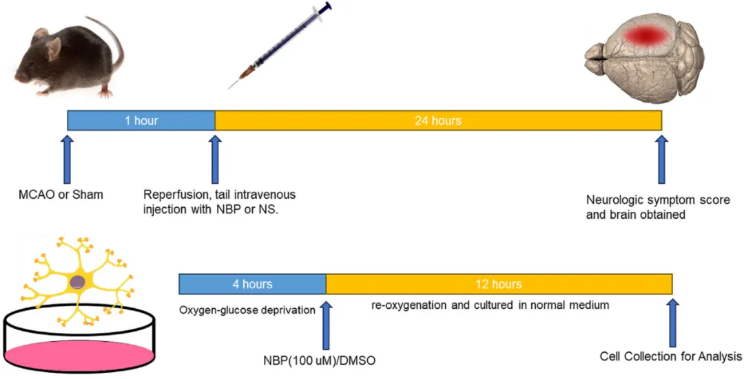 體內實驗中,通過閉塞大腦中動脈1小時后再灌注,構建小鼠腦缺血再灌注模型。再灌注的同時靜脈注射NBP或生理鹽水,24小時后評估包括神經系統評分和代謝物改變在內的藥效指標。體外實驗中,運用HT22小鼠神經元細胞系構建缺氧復氧細胞模型評估NBP的療效,具體如圖1所示。