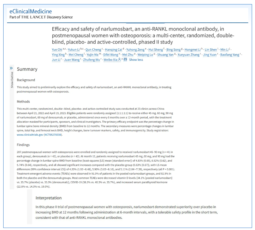 近日,由石藥集團研發的納魯索拜單抗(JMT103)針對絕經后骨質疏松患者的臨床研究結果以研究論文(Article)形式發表于Lancet?子刊?eClinicalMedicine,標題為:Efficacy and safety of narlumosbart, a fully-humanized anti-RANKL monoclonal antibody, in postmenopausal women with osteoporosis: a multi-center, randomized, double-blind, placebo- and active controlled, phased II study.