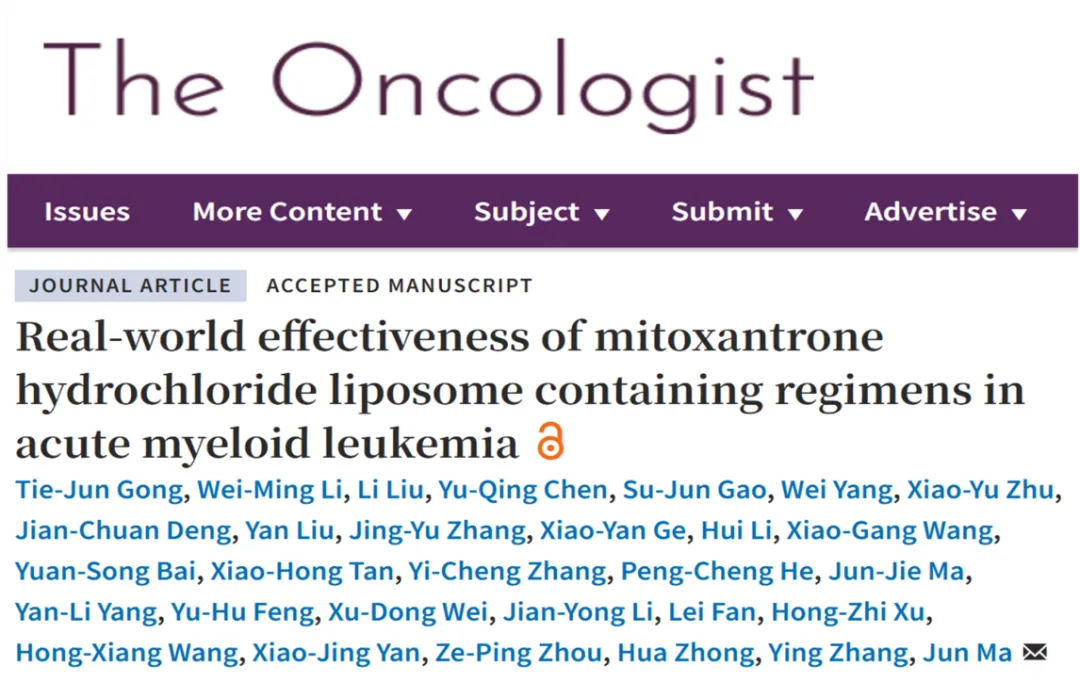 近期, 一項由哈爾濱血液病腫瘤研究所馬軍教授牽頭開展的,鹽酸米托蒽醌脂質體注射液治療急性髓系白血病(AML)的全國多中心、真實世界研究結果于《The Oncologist》雜志正式發表,該數據首次披露了真實世界中米托蒽醌脂質體在AML患者的療效以及安全性,為其在白血病的應用提供更多循證證據。