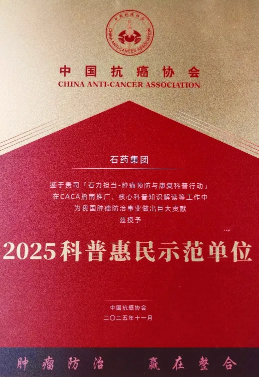 石藥集團(tuán)榮獲中國(guó)抗癌協(xié)會(huì)“2025年科普惠民示范單位”