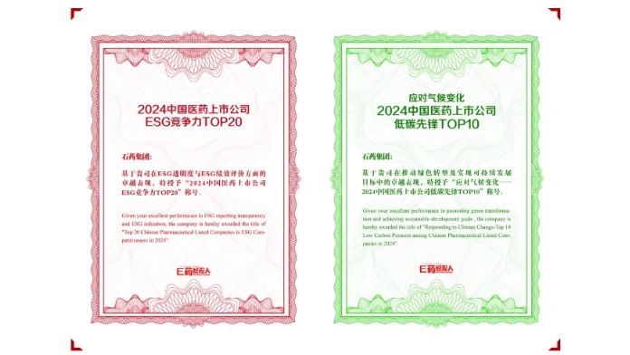 2024年11月14日,由中國醫(yī)藥企業(yè)管理協(xié)會、中國醫(yī)藥生物技術協(xié)會、四川省醫(yī)藥行業(yè)協(xié)會主辦,E藥經(jīng)理人承辦的2024第16屆中國醫(yī)藥企業(yè)家科學家投資家大會(CHSESI,簡稱“啟思會”)在成都舉行。2024年度中國醫(yī)藥上市公司ESG競爭力系列榜單在會上正式揭曉,石藥集團憑借在ESG透明度與ESG績效評價方面的卓越表現(xiàn),被授予“2024中國醫(yī)藥上市公司ESG競爭力TOP20”榮譽稱號;并基于公司在推動綠色轉(zhuǎn)型及實現(xiàn)可持續(xù)發(fā)展目標中的卓越表現(xiàn),被授予“應對氣候變化2024中國醫(yī)藥上市公司低碳先鋒TOP10”。這兩項榮譽肯定了集團在環(huán)境、社會和治理(ESG)方面付出的努力和顯著成效,企業(yè)價值得到進一步的印證。